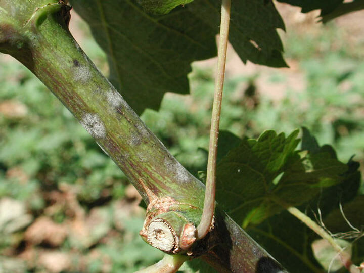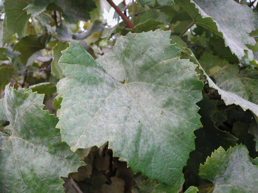 Pažeidžiamos visos žalios vynmedžio dalys, taip pat ir uogos. Stipri infekcija gali deformuoti lapus, jie išdžiūsta ir nukrenta anksčiau laiko. Uogos pasidengia baltomis apnašomis, skilinėja ir nesunoksta.