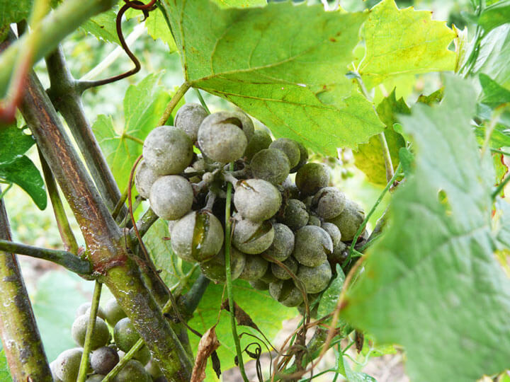 - Pažeistos uogos pasidengia baltu pūkeliu, vėliau suskyla, džiūna ir netinka vartojimui.