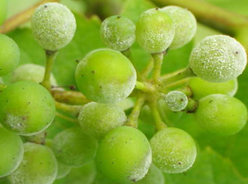 - Pažeisti žiedynai, kekės ir ūglių galiukai atrodo tarsi apibarstyti miltais ar pelenais.