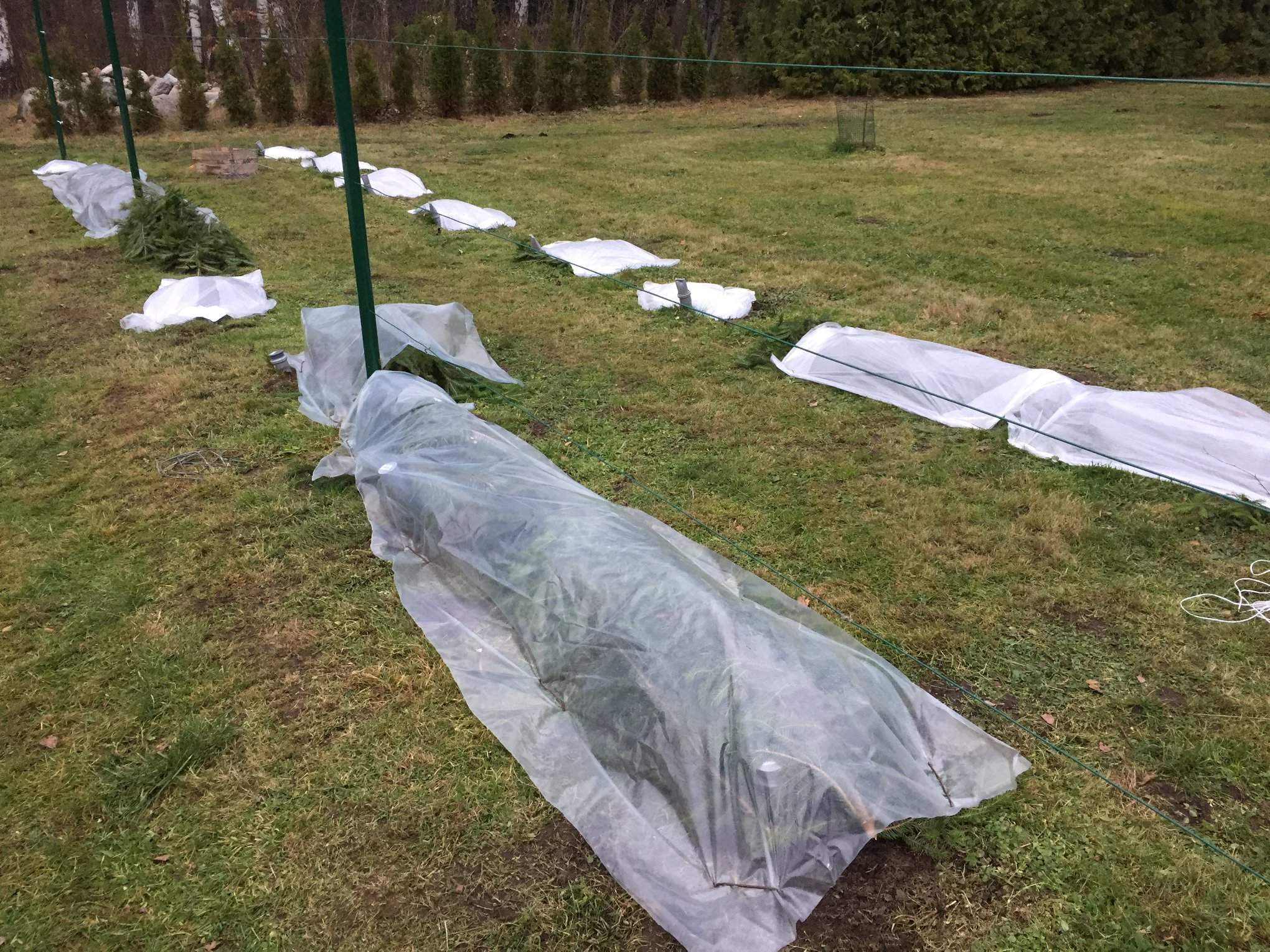 Artėjant pirmiems šalčiams vynmedžiai dengiami – atrišami, nugenimi, prilenkiami prie žemės, prismeigiami sulenkta viela ir uždengiami. Tinkamiausia vynmedžius dengti taip, kad negulėtų ant žemės, po jais paklojama eglišakių, jomis taip pat uždengiamas ir viršus. Ant eglišakių uždengiama polietileno plėvelė. Po eglišakėmis vynmedžiai gerai išsilaiko, nes yra sudaromas oro tarpas, jie nepelyja ir neiššunta pumpurai, eglišakių nemėgsta pelės.